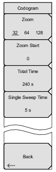 ![]() | Zoom: Select a zoom function of 32, 64, or 128 codes. Zoom Start: Enter the required zoom start code. For example, to start at code 2, enter 2. Total Time: Use the keypad, arrow keys, or the rotary knob to enter the total time to display the changes in code power levels. The maximum total time for Codogram is 72 hours. Single Sweep Time: Single sweep time is related to total time. Use the keypad, arrow keys, or the rotary knob to set the single sweep time. Back: Returns to the Demodulator Menu. |