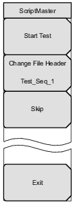![]() | Opens the Select File by Scrolling window and also lists Recall and Back submenu keys. Recall a Script file, created in Master Software Tools, from the window. The ScripMaster instructions are loaded into the instrument and the ScriptMaster menu is listed. Start Test: Runs the test instructions listed in ScriptMaster. Change File Header: Opens the Pass Fail Test File Header entry window and lists the Text Entry menu to name the saved file after the ScriptMaster measurement process is complete. Skip: Skips over a ScripMaster instruction. Exit: Ends the ScriptMaster measurement process. Returns the instrument to the previous measurement setup. |