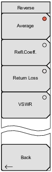 ![]() | Press the submenu key for the desired measurement parameter. Then press the Back submenu key. Average Press this submenu key to have the sensor measure the average power in the reverse direction. Refl. Coeff. Press this submenu key to measure the reflection coefficient (reflected power / forward power). Return Loss Press this submenu key to measure return loss. VSWR Press this submenu key to measure VSWR. Back Press this submenu key to return to the Display menu. |