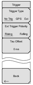 ![]() | Trigger Type: Select a trigger type by pressing this submenu key to toggle among No Trig, GPS, or Ext. The active state is underlined on the face of the submenu key. Ext Trigger Polarity: Press this submenu key to toggle either Rising or Falling polarity of external trigger. Tau Offset: Press this submenu key to add an offset (5 sec is the maximum offset that can be entered) to the current Tau value. Back: Press this submenu key to return to Setup Menu. |