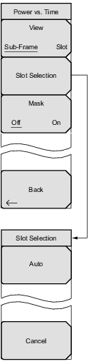 ![]() | View: Press this submenu key to display the Power vs. Time graph in either the Sub‑Frame view or the Slot view. Slot Selection: Press this submenu key to display the Slot Selection menu and open the Slot Selection window. Use the rotary knob or press the touch screen to highlight the desired slot (0 to 6), then press Enter. If Auto is selected, the active slot will be detected automatically. Auto: Automatically looks for an active downlink slot. Auto in the Slot Selection window and the Auto submenu key have the same function. Cancel: Cancels any new setting you have highlighted without pressing Enter. If the Slot Selection currently in effect is highlighted, returns to the Power vs. Time menu. Mask: Press this submenu key to turn the mask On and Off. Back: Press this submenu key to return to the Measurements Menu. |