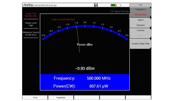 4. Press the Amplitude key and set the power level to High or Low. The typical nominal output power in the high setting is about 0 dBm. The typical nominal output power in the low setting is about –30 dBm.