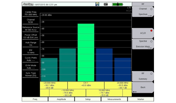 ACLR (Adjacent Channel Leakage Ratio) is defined as the ratio of the amount of leakage power in an adjacent channel to the total transmitted power in the main channel and is displayed in table format under the bar graph. The ACLR screen displays the main channel power and the power of two adjacent channels on each side as a bar graph. For example, when BW is set to 10 MHz, the channel spacing is – 20 MHz, – 10 MHz, + 10 MHz and + 20 MHz and the channels are color coded.