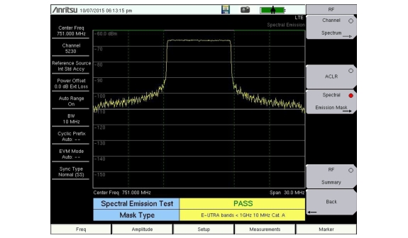 The Spectral Emission Mask (SEM) measurement supports the testing for “Operating Band Unwanted Emissions” described in the 3GPP TS 36.141 Base Station Conformance testing document. There is support for Category A and Category B (Option 1 only) masks which are automatically selected based on the current carrier frequency/channel and BW values.