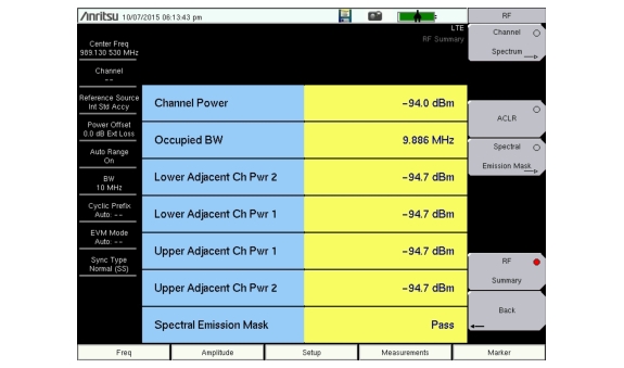 The RF Summary is a display of the occupied bandwidth, power of the main channel, upper adjacent channels, and lower adjacent channels in a table format. The RF Summary also shows the SEM status: PASS or FAIL. Refer to individual RF measurement descriptions for additional details on each measurement.