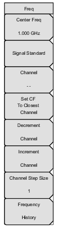 ![]() | Center Freq: Press this submenu key to set the receiver center frequency to the desired value. Enter the frequency by using the keypad, the arrow keys, or the rotary knob. When entering a frequency using the keypad, the submenu key labels will change to Units: GHz, MHz, kHz, and Hz. Press the appropriate units submenu key. Pressing the Enter key has the same effect as pressing the MHz submenu key. Note: When switching from the Carrier Aggregation to other measurements, the frequency is automatically set to the currently selected Component Carrier, if it is on. Signal Standard: Opens the Standard List Menu. Channel: Opens the Channel Editor list box in order to select a channel number within the range of the selected signal standard. Set CF to Closest Channel: Moves the center frequency to the closest frequency that matches a channel number in the current signal standard. Decrement Channel: Decrements the channel by one channel. Increment Channel: Increments the channel by one channel. Channel Step Size: Use this submenu key to specify the step size used for incrementing or decrementing the channel number. Change the step value by using the arrow keys or rotary knob. Press the Enter key to set the value. Frequency History: Opens a list box that displays the last five selected frequencies. When a frequency is entered using the Center Frequency submenu key or the Signal Standard/Channel submenu keys, the list will be updated. |