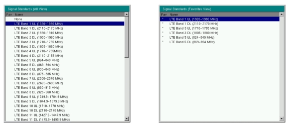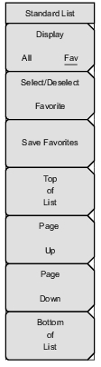 ![]() | Display: Toggles between displaying all available signal standards and the signal standards marked as favorites (* in the Fav column). Select/Deselect Favorite: Press this submenu key to select or deselect a signal standards as a favorite. Save Favorites: Press this submenu key to have the instrument save to memory the signal standards were selected as favorites. Next time the signal standard list is displayed, these signal standard will be marked as favorites (* in the Fav column). Top of List: Press this submenu key to display the first signal standard in the list. Page Up: Press this submenu key to scroll up one page in the signal standard list. Page Down: Press this submenu key to scroll down one page in the signal standard list. Bottom of List: Press this submenu key to display the last signal standard in the list. Press Esc to close the Signal Standards list and return to the Frequency menu. |