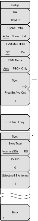BW: Opens the Select Bandwidth list. Choose from the available bandwidths. Cyclic Prefix: Press this key to set the instrument to measure signal with a Normal or Extended Cyclic Prefix, or to allow the instrument to detect the Cyclic Prefix automatically. EVM Max Hold: Turn the EVM Max Hold submenu key On to display both the Maximum EVM value since Reset and the current measured value. This applies to EVM RMS and Peak values. Selecting Off displays only the current measured value. EVM Mode: Press to select either Auto or PBCH Only. Selecting Auto measures PDSCH if data is available, otherwise, it measures PBCH. Selecting PBCH Only forces a PBCH measurement and the constellation measurement will only show QPSK. The instrument will automatically choose PBCH Only mode when the OTA Scanner is used. Sync: Opens the Sync submenu. Sync Type: Press to choose between the Normal (SS) or RS (Reference Signal) Sync Type. Only choose RS when there is no sync signal present in the transmitter under test. If RS is chosen and a sync signal is present, no modulation measurements will be available. Cell ID: Identifying information sent by the transmitter in the sync signal. If Normal (SS) is selected as the Sync Type, the Cell ID is extracted automatically from the Sync Signal. The Cell ID must be entered manually when RS Sync Type is selected. For user convenience, the Cell ID is automatically populated from the last measured signal with an SS. Select noSS Antenna: Select the antenna (1 through 3) in a 4x4 MIMO system that does not receive a sync signal. Antenna 0 must receive a sync signal. This selection is applicable only in RS Sync Type. Back: Returns to the Setup menu. Freq Err Avg Cnt: When the count is greater than one, the frequency error value is averaged over past measurements. If the count is one, then no averaging occurs. Ext. Ref. Freq (Only Some Models): Press to set the external reference frequency. The External Reference Frequency list opens. Highlight the desired frequency and press Enter. |