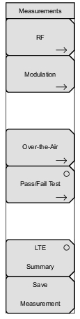 ![]() | RF: Press this submenu key to display the RF Menu. Modulation: Press this submenu key to display the Modulation Menu. Over‑the‑Air: Press this submenu key to display the Over‑the‑Air Menu. Pass/Fail Test: Press this submenu key to activate the Pass/Fail test. Press key again to display the Pass/Fail Test Menu and set up pass/fail testing. LTE Summary: Press this submenu key to display a table of the LTE measurements. The following measurement values are displayed in the table: Freq Error Occupied BW Carrier Frequency Channel Power Ref Signal (RS) Power Sync Signal (SS) Power EVM (rms) PBCH Power PCFICH Power Spectral Emission Mask Save Measurement: Press this submenu key to save a measurement. You may accept the default filename or enter your own filename. Refer to your instrument’s User Guide for information on file management functions. |