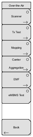 ![]() | Scanner: Press this submenu key to display the Scanner table, which shows several power measurements for multiple base stations at the same frequency. Measurements include Sync Signal (S-SS) Power, RSRP, RSRQ, and SINR. Press the key again to display the OTA Scanner Menu to set up Sort By and Show Mod Results. Tx Test: Opens the OTA Tx Test mode. Press it again to open the Over‑the‑Air Tx Test Menu and the Show Mod Results submenu key. Mapping: Sets the display for coverage mapping. Press it again to set the coverage mapping parameters – Save/Recall Points/Map, Measurement Setup and Point Distance/Time Setup. For full details, refer to LTE and TD‑LTE Coverage Mapping. Carrier Aggregation: Press this submenu key to display the Carrier Aggregation Component Carrier frequencies and measured parameters. In the Carrier Aggregation Menu, select the desired Component Carrier to set up for measurement. Refer to Carrier Aggregation Menu. EMF (Option 444 only): When first selected, this submenu key enables the EMF Measurement mode. See EMF Measurements (Option 444) for more information. eMBMS: When selected, this submenu key enables the OTA eMBMS Test Measurement mode. Once this mode is active, the display area indicates the Cell ID and the RSRP (Reference Signal Received Power). Note that eMBMS information may require several frame captures and each capture can take several seconds to analyze. NA will be displayed until a valid measurement is achieved. Back: Press this submenu key to return to the Measurements Menu. |