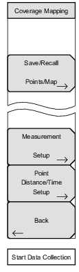 ![]() | Measurement Setups: Opens the Measurement Setup Menu. Point Distance/Time Setup: Opens the Point Distance/Time Setup Menu. Back: Returns to the Over‑the‑Air Menu. Start/Stop Data Collection: Press this main menu key to start coverage mapping data collection based on Measurement Setup settings and Point Distance/Time Setup settings. A running count of collected data points is displayed at the bottom of the screen. Press again to stop data collection. |