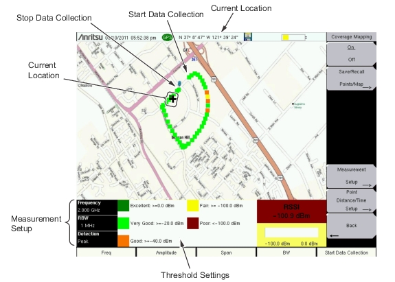 Coverage Mapping is possible both outdoors (GPS signal required) and indoors (no GPS signal). For more accurate position data for indoor measurements, use a stylus such as the Anritsu 2000-1691-R.
