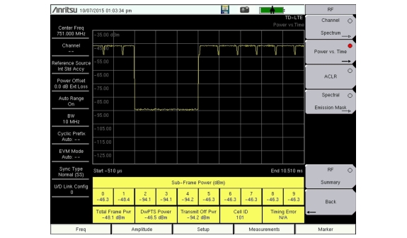 Power vs Time displays the power of the received signal in the time domain. A submenu allows the user to toggle between viewing 1 full Frame and 1 Sub‑Frame and specify a Sub‑Frame number when viewing just the Sub‑Frame.