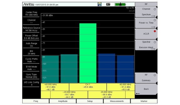 ACLR (Adjacent Channel Leakage Ratio) is defined as the ratio of the amount of leakage power in an adjacent channel to the total transmitted power in the main channel and is displayed in table format under the bar graph. The ACLR screen displays the main channel power and the power of two adjacent channels on each side as a bar graph. For example, when BW is set to 10 MHz, the channel spacing is – 20 MHz, – 10 MHz, + 10 MHz and + 20 MHz and the channels are color coded.