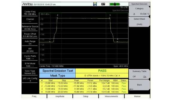 The Spectral Emission Mask (SEM) measurement supports the testing for “Operating Band Unwanted Emissions” described in the 3GPP TS 36.141 Base Station Conformance testing document. There is support for Category A and Category B (Option 1 only) masks which are automatically selected based on the current carrier frequency/channel and BW values.