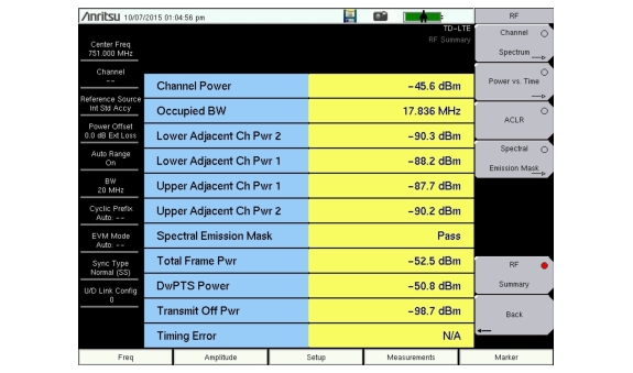 The RF Summary is a display of the occupied bandwidth, power of the main channel, upper adjacent channels, and lower adjacent channels in a table format. The RF Summary also shows the SEM status: PASS or FAIL. Refer to individual RF measurement descriptions for additional details on each measurement.