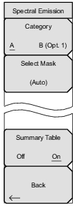 Spectral Emission Mask: Opens the Spectral Emission Menu. The Spectral Emission Mask measurement supports the testing for “Operating Band Unwanted Emissions” described in the 3GPP TS 36.141 Base Station Conformance testing document. There is support for Category A and Category B (Option 1 only) masks which are automatically selected based on the current carrier frequency/channel and BW values.