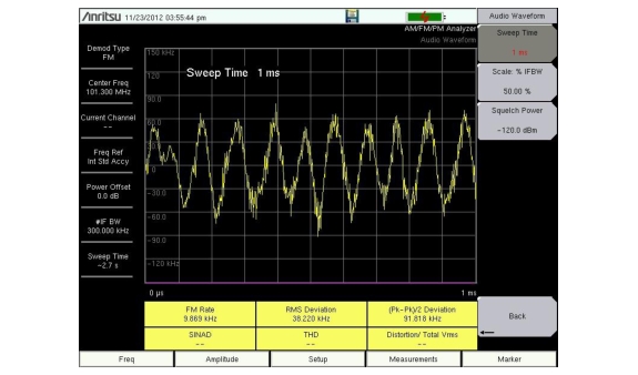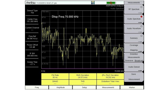 10. From the Measurements menu, press the Audio Demod submenu key to listen to the audio component of the FM signal. In this menu, you can choose wideband or narrowband demodulation, set the demodulation time, and you can also set the instrument speaker volume.