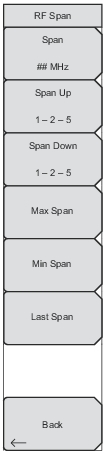 ![]() | Span Press to set the RF Span. If you use the numeric keypad to enter a value, then the submenu keys change to Units of GHz, MHz, kHz, or Hz. Pressing the Enter key is the same as pressing the MHz submenu key. You may also use the rotary knob or the arrow keys, then press the Enter key. Span Up Press to increase the Span. If starting at 10 kHz, the span increases to 20 kHz, 50 kHz, 100 kHz, 200 kHz, 500 kHz, 1 MHz, 2 MHz, 5 MHz and 10 MHz. Each press of this submenu key increases the span to one of these listed values. Span Down Press to decrease the Span. If starting at 5 MHz, then span decreases to 2 MHz, 1 MHz, 500 kHz, 200 kHz, 100 kHz, 50 kHz, 20 kHz, and 10 kHz. Each press of this submenu key decreases the span to one of these listed values. Max Span Press to set the span to 10 MHz, the maximum value. Min Span Press to set the span to 10 kHz, the minimum value. Last Span Press to set the span to the previously set span value. Back Press to return to the RF Freq menu. |