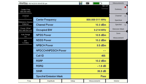 2. Press the Summary key to display the NB‑IoT measurement results in table format. See Figure: NB-IoT Summary.