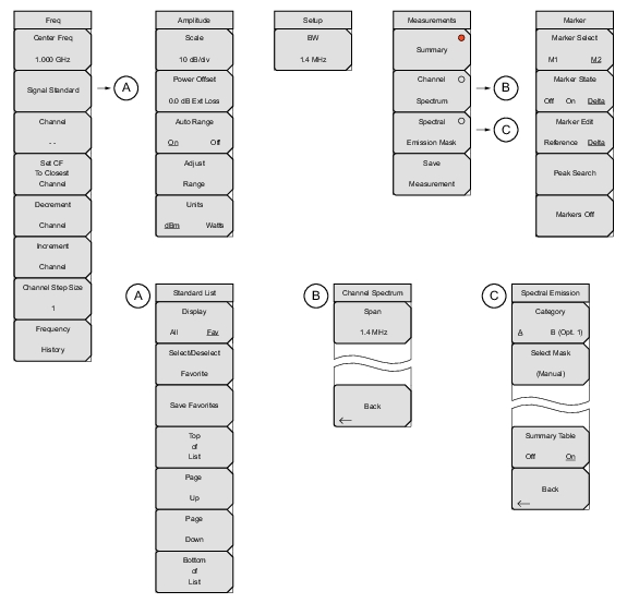 For a description of the Frequency, Amplitude, and Marker menus, refer to the corresponding section in