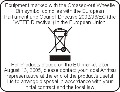 Anritsu affixes the CE Conformity marking onto its conforming products in accordance with Council Directives of The Council Of The European Communities in order to indicate that these products conform to the EMC and LVD directive of the European Union (EU).