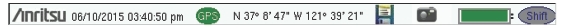 The instrument title bar displays the system date and time. When GPS is on and is tracking satellites, its icon is followed by latitude and longitude coordinates.