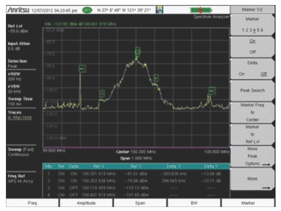 4. Press the Peak Search submenu key to move the active marker to the highest signal amplitude that is currently displayed on screen. For additional marker movements, press the More Peak Options submenu key. Refer to the Spectrum Analyzer Measurement Guide for more details.