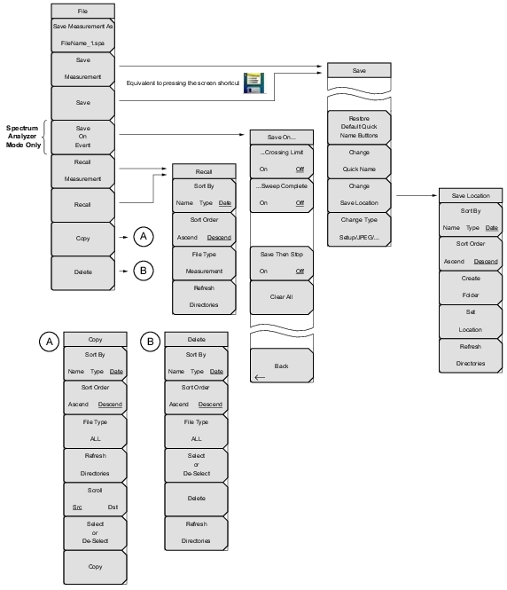 Open the File menu by pressing the Shift key, then the File (7) key. Menu maps typically display all possible submenu keys, although some keys are displayed on the instrument only under special circumstances (refer to menu descriptions on the following pages).