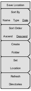 ![]() | Sort By Name Type Date Press this submenu key to choose the item by which folders are sorted in the Select Save Location list. See Figure: Save Location Screen. Sort Order Ascend Descend Press this key to toggle the sort order of the folder list between Ascending and Descending. Create Folder Press this submenu key to create a new folder inside the selected directory. Enter the new folder name in the Create Directory dialog and press Enter. To return to the Select Save Location dialog without creating a new folder, press Esc. Set Location Press this submenu key to set the currently selected folder as the destination where saved files will be stored, and to return to the Save Menu. Press Esc to exit without saving. Refresh Directories Press this key to update the folder list after connecting or disconnecting an external USB drive. |