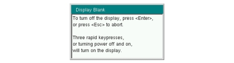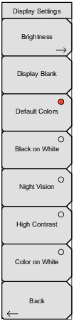![]() | Brightness: Opens the Brightness Settings Menu. Display Blank Opens the message box illustrated in Figure: Display Blank Message Box. Press Enter to turn off the display, or press Esc to abort. To turn the display back on, press any key (except the Power button) three times in rapid succession. A power cycle also turns the display back on. Default Colors Sets the display colors to the factory defaults. Used for normal viewing. Black on White Sets the display colors to black on a white background. Used for printing and viewing in broad daylight conditions. See Figure: Display Color Settings for illustrations of the display color schemes selectable in this submenu. Night Vision Sets the display to a red-tinted color on a black background. The front panel keypad is backlighted in red. This setting is optimized for nighttime viewing. High Contrast: Increases the black and white contrast of the default display. This setting is used in challenging viewing conditions. Color on White Sets the display background to white, the grid to gray, and leaves sweep data in color. This setting is used for printing and viewing in broad daylight conditions. Back Press this submenu key to return to the System Options Menu. |