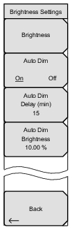 ![]() | The brightness of the display can be adjusted to optimize viewing under a wide variety of lighting conditions. Brightness: Press this submenu key to open the Brightness Editor window, where you can adjust the display brightness level from 0 to 100, with 100 being the brightest. See Figure: Brightness Editor Input Box. Use the rotary knob to adjust the value in increments of 5, or press the Up/Down arrow keys to change the value in increments of 25. Press the Left or the Right arrow key to jump to 0 or 100, respectively. Press Enter to accept the change. All display elements on the instrument screen are affected by the Brightness setting. Auto Dim On/Off Press this submenu key to toggle the display auto-dimming feature on and off. Enabling auto-dim can extend battery life. Auto Dim Delay Press this key to adjust the amount of idle time, from 1 to 15 minutes, before the instrument display goes dim. Use the arrow keys or the rotary knob to adjust the value in increments of 1. You can also use the numeric keypad, then press Enter. Out-of-range values are ignored. Auto Dim Brightness Press this submenu key to select the brightness percentage level of the display when it is dimmed. Use the arrow keys or the rotary knob to adjust the value in increments of 5%, from 0% to 25%. You can also use the numeric keypad, then press % or the Enter key. Out-of-range values are ignored. Back Press this submenu key to return to the Display Settings Menu. |