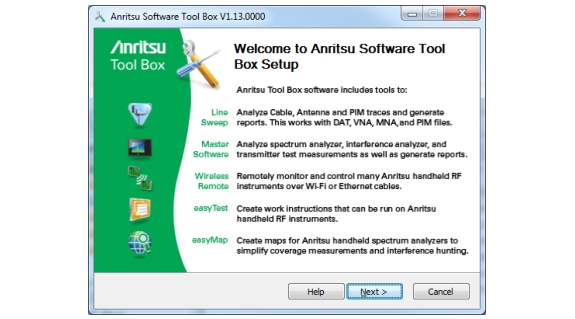 Whether running the installer directly or executing the saved file, follow the instructions on screen. The Setup screen illustrated in Figure: Anritsu Tool Box Setup Wizard may change with the software version.