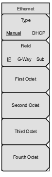 If Manual is selected, use the submenu keys or the Left/Right arrow keys to select the field that is to be modified in the Ethernet Editor dialog. Use the numeric keypad, the Up/Down arrow keys, or the rotary knob to enter the values. Press Enter to accept the changes, or press the Esc key to exit Ethernet Configuration without making changes.