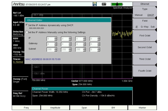 The instrument IP address is set by pressing the Shift key, then the System (8) key followed by the System Options submenu key and the Ethernet Config submenu key. The instrument Ethernet address can be set automatically using DHCP, or manually by entering the static IP address, gateway address, and subnet mask.