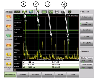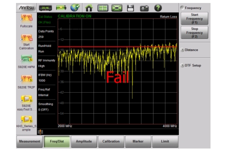 Remember that Return Loss and VSWR are typically Pass/Fail tests. They both measure reflection, but they display the results in different ways. For either measurement, set a limit line to the specification determined by the carrier and make the measurement. If the ENTIRE swept frequency range is below the limit line, then the test passes. If ANY part of the sweep is at or above the limit line, then the test fails.