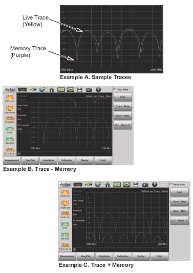 Notes | The trace math functions often seem backwards to new users. The points to remember with Trace ‑ Memory, Trace + Memory, and (Trc + Mem) / 2 are: • The numbers on the y‑axis are negative. • The purple trace is added to or subtracted from the live trace. The sum or difference of the live trace and memory trace is displayed in yellow. |