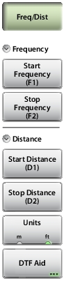 ![]() | Frequency Start Frequency (F1) Press the Start Frequency (F1) submenu key and enter the desired frequency using the Up/Down Arrow keys, the rotary knob, or the keypad. Press Enter to complete the entry or, if entering a frequency using the keypad, press the appropriate units key. Stop Frequency (F2) Press the Stop Frequency (F2) submenu key and enter the desired frequency using the Up/Down Arrow keys, the rotary knob, or the keypad. Press Enter to complete the entry or, if entering a frequency using the keypad, press the appropriate units key. Distance Start Distance (D1) Press the Start Distance submenu key and enter the desired distance using the Up/Down Arrow keys, the rotary knob, or the keypad. Press Enter to complete the entry or, if entering a distance using the keypad, press the appropriate units key. Stop Distance (D2) Press the Stop Distance submenu key and enter the desired distance using the Up/Down Arrow keys, the rotary knob, or the keypad. Press Enter to complete the entry or, if entering a distance using the keypad, press the appropriate units key. Units Press the Units key to toggle distance units between meters and feet. DTF Aid Opens the DTF Aid dialog box (Figure: DTF Aid). This interactive parameter box allows setting multiple parameters and displays maximum testing distance and resolution. |