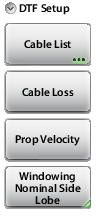 ![]() | DTF Setup Cable List The Cable List submenu key opens a list of available cable specifications (Figure: Cable List Selection Displayed Under the Graph). Using Up/Down Arrow keys, the rotary knob, or the touchscreen, select the desired cable and press Enter. Note: When a cable is selected from this list, propagation velocity and cable loss are automatically set by the instrument. If the preselected values for propagation velocity or cable loss are changed, then the analyzer will use “NONE” as the cable type. Cable Loss Press the Cable Loss submenu key and enter the loss in dB/ft or dB/m for the selected cable using the keypad, Up/Down Arrow keys, or the rotary knob and press Enter. Prop Velocity Press the Prop Velocity submenu key and enter the applicable propagation velocity for the selected cable using the keypad, Up/Down Arrow keys, or the rotary knob and press Enter. Windowing Opens the Windowing Menu. |