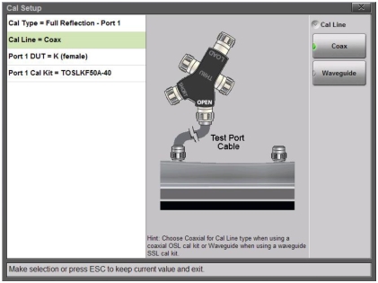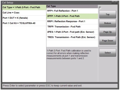 2PFP: 1-Path 2-Port – Fwd Path | 1-Path 2-Port – Fwd Path calibration is used to correct for all errors when making reflection measurements at port 1 and transmission measurements between ports 1 and 2. This cal type requires four connections to Port 1: Open, Short, Load, Thru (between Port 1 and 2). The Isolation step, using a load connection on each port, is optional. If used, it will improve the dynamic range performance of the Thru measurement. |