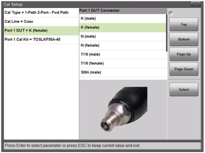 For the most accurate calibrations, you must select the connector of the DUT that will be attached to Port 1 of the instrument. After you select the DUT connector, you must then select the desired calibration kit that will be used for the Port 1 correction. If you do not select a desired calibration kit, then the analyzer defaults to one of the built‑in kits.