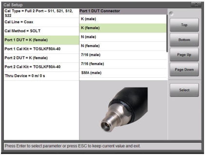 For the most accurate calibrations, you must select the connector of the DUT that will be attached to Port 1 or Port 2 of the instrument. After you select the DUT connector, you must then select the desired calibration kit that will be used for the Port 1 or 2 correction. If you do not select a desired calibration kit, then the analyzer defaults to one of the built‑in kits.