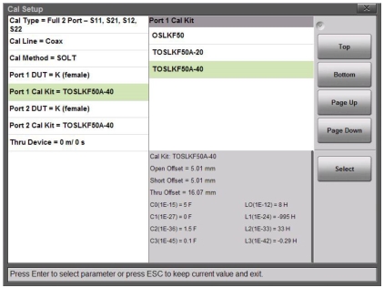 For each coaxial kit in the list, the values of the Offset Lengths for the Open, Short, and Thru (if applicable) are listed. The Capacitance and Inductance values for the Open and Short are also listed, as shown in Figure: Selection Window for Port 1 Cal Kit. For waveguide calibration kits, the Cutoff Frequency and the Offset Short 1 and Short 2 lengths are listed.