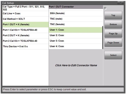 If you are using custom connectors that are not already listed, then the Site Master S820E allows you to create up to ten User DUT connectors and corresponding User Cal Kits. Choose one of the User connectors from the Port 1 DUT Connector list, as shown in Figure: Cal Setup, Port 1 DUT Connectors. You can edit the name of the DUT connector, as indicated on the Site Master screen.