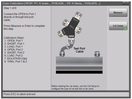 Figure: Calibration Dialog Box for Coax shows the Calibration dialog box illustrating calibration setup and calibration steps. On‑screen instructions are given for each step.