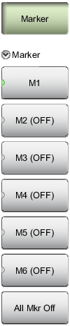 ![]() | Marker After pressing the Marker button, Marker 1 (M1) is automatically turned on and appears at the last used location. If no last used location exists (after a preset for example), then Marker 1 appears in the center of the measurement screen. M1 Press to display the Marker 1 menu (Figure: Marker Menu (2 of 2)), which gives access to marker parameter settings. The key label displays the marker number only (M1 for example) when the marker is ON, and displays M1 (OFF) when the marker is not in use. The green half circle also indicates that the marker is ON. Submenu keys M2 through M6 behave in the same manner as M1. All Mkr Off Press this key to turn OFF all markers. |