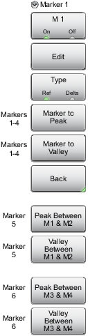 ![]() | Marker M 1 (On Off) Press this key to turn OFF the selected marker (M1 to M6). Edit Press this key to enter a marker value. Type (Ref Delta) Press this key to toggle the marker type between Reference and Delta. This key is displayed for markers M2 through M4 only. Marker M1 is a Reference marker only. Marker to Peak Press this key to set a Marker (M1 to M4 only) on the highest signal amplitude in the displayed trace. Marker to Valley Press this key to set a Marker (M1 to M4 only) on the lowest signal amplitude in the displayed trace. Back Press this key to return to the Marker menu. Markers 5 and 6 can perform a special Marker search to find the Peak or Valley between two other markers. When Marker 5 is Active: Peak Between M1 & M2: Places Marker 5 on the highest signal amplitude between Marker 1 and Marker 2. Valley Between M1 & M2: Places Marker 5 on the lowest signal amplitude between Marker 1 and Marker 2. When Marker 6 is Active: Peak Between M3 & M4: Places Marker 6 on the highest signal amplitude between Marker 3 and Marker 4. Valley Between M3 & M4: Places Marker 6 on the lowest signal amplitude between Marker 3 and Marker 4. |