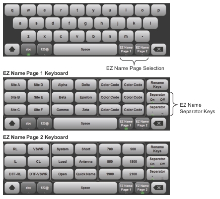 Press one of the two EZ Name Page Selection keys to display the EZ Name keyboard, then touch an EZ Name key to enter the corresponding preset character string in the Filename edit box.