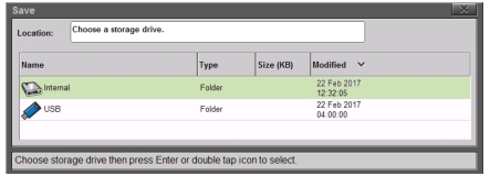 Files can also be saved to an external storage drive like a USB removable disk. Double-tap Drive: in the Location directory path to open the dialog below, then select the removable disk and press Enter. Select or create any subfolders as needed.