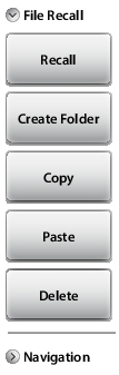 ![]() | File Recall Navigation Top Press this key to navigate to the top item of the current location. Bottom Press this key to navigate to the bottom item of the current location. Page Up Moves up one screen of items (7 rows) in the current location. Page Down Moves down one screen of items (7 rows) in the current location. |